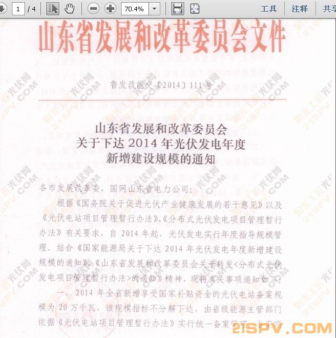 山东省发展和改革委员会关于下达2014年光伏发电年度新增建设规模的通知