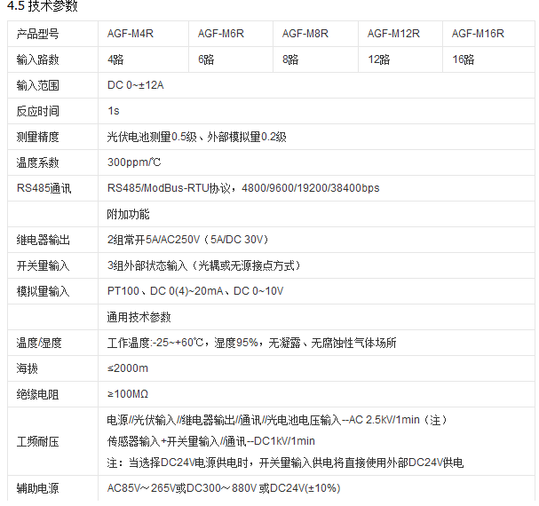 光伏电池串开路报警,状态检测带开关量输入,用于采集直流断路器、防雷器等元件的动作状态带继电器输出,可以设定为点动方式,用于驱动直流断路器的自动分合闸提供温度、辐照、风速等类型传感器输入接口可输出DC24V电源给外部传感器供电就地数码管循环显示每通道的输入电流,并具有自动关闭节能显示模式RS485接口,支持Modbus RTU通讯协议,通讯地址、波特率、数据方式都可自由设定。