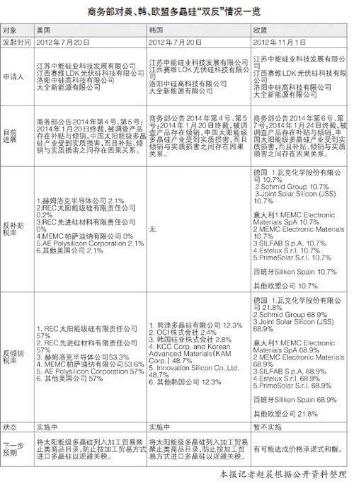 索比光伏网讯:随着商务部对美国、韩国多晶硅“双反”终裁和欧盟多晶硅“双反”初裁结果的出炉,这件一直牵动着全球太阳能光伏产业链各环节以及众多关心新能源产业发展人士神经的大事,总算是告一段落了。对美国的高税率、对韩国的低税率、对欧盟暂不实施的税率,这些经过再三权衡却仍备受争议的数字背后,又有着哪些深层次的矛盾和冲突?