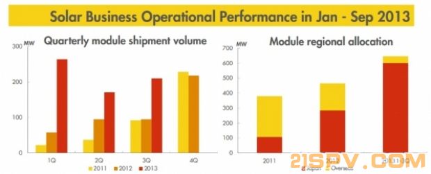 2013年第四季度组件出货量接近300MW,较上季度出货量约200MW大幅提高。2013年前九个月,Solar Frontier超过2012年的总出货量。