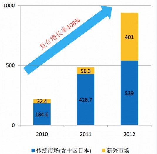 南非是晶澳太阳能开拓新市场的其中之一,更早也更吸引目光的还有中国及日本市场,2012年第二季度开始,晶澳中国组件出货量大幅提升,到第四季度占比达到46%,2013年持续保持;2013年上半年晶澳同时成为中东地区最大中国组件供应商,新市场的开拓使晶澳全球业务市场占比出现变化,传统市场逐渐降低,新市场占比增加,整体复合增长率108%(如图一),风险得到分散。