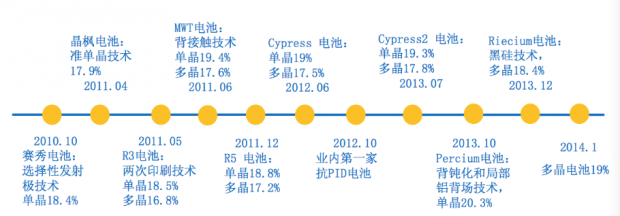 “2014年2月日本光伏展会期间,我们将正式推出已经研发成功的Percium高效单晶和Riecium高效多晶电池。其中Percium电池采用背钝化和局部铝背场技术,单晶电池转换效率达到20.3%,高于行业平均水平1.3%,Riecium电池采用黑硅技术,多晶电池转换效率达到18.4%,高于行业0.8%。”晶澳首席技术官及首席运营官刘勇向记者介绍,这两款电池不出意外将成为新一代主流电池,Percium电池和Riecium电池全部为晶澳自主研发完成,包括设备研发。