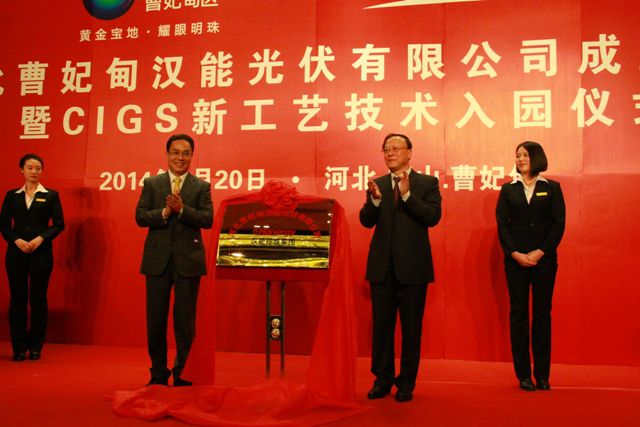2014年1月20日上午,河北曹妃甸汉能光伏有限公司成立揭牌暨铜铟镓硒(CIGS)新工艺技术入园仪式在唐山市举行。河北曹妃甸汉能光伏有限公司正式挂牌成立。这一次,汉能透露消息称,这个由汉能太阳能光伏科技有限公司出资建设的公司,将在曹妃甸建设总规模3GW铜铟镓硒(CIGS)薄膜太阳能电池及柔性应用产品项目,项目总投资350亿元,占地约1500亩。项目分两期建设,一期建设0.6GW铜铟镓硒(CIGS)薄膜太阳能电池组件项目,投资60亿元,计划2014年底建成投产;二期建设2.4GW铜铟镓硒(CIGS)薄膜太阳能电池及柔性应用产品项目,投资290亿元,计划2015年底建成投产。