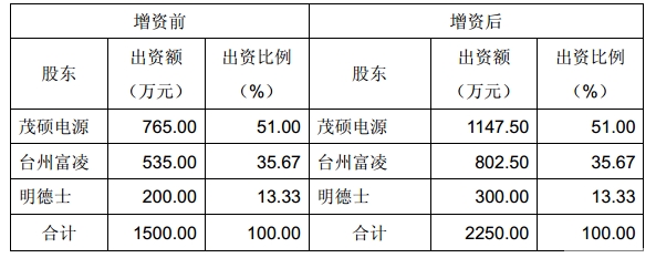 茂硕电源本次拟以人民币765万元认购深圳富凌382.5万股,其中382.5万元计入深圳富凌的注册资本,溢价部分382.5万元计入深圳富凌的资本公积。公司表示,本次增资为同比例增资,不会影响公司对深圳富凌的控制权,对公司正常生产经营不会造成影响。