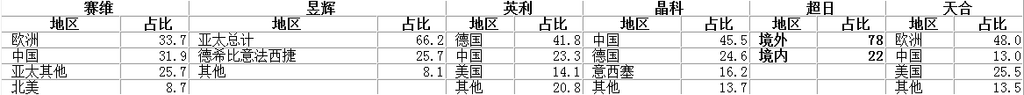 表2:2012年中国主要组件厂商收入地区结构(%)