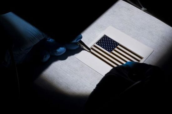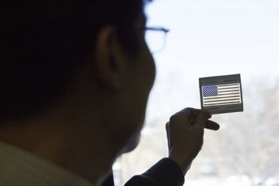 使用这种彩色太阳能电池,该团队制成了一小片“美国国旗”。虽然成品看似一片装饰用的玻璃,但其在阳光下产生的电流,仍有差不多2mA(2%的转换效率)。