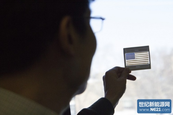 使用这种彩色太阳能电池,该团队制成了一小片“美国国旗”。虽然成品看似一片装饰用的玻璃,但其在阳光下产生的电流,仍有差不多2mA(2%的转换效率)。
