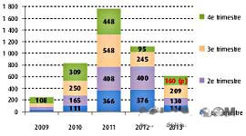 法国生态、能源与可持续发展部近日公布2013年第四季度及全年光伏电站投产规模的初始数据报告。据报告显示,2013年,法国光伏市场规模暴跌45%,仅为613兆瓦。基于不同的标准,该数据低于法国电网运营商RTE公布的数据(743兆瓦)。