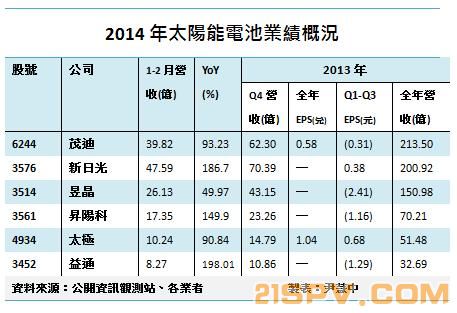 太阳能电池厂2月营收不受工作天数减少者包含太极(4934-TW)月增5.35%、益通(3452-TW)月增2.69%、升阳科(3561-TW)月增2.37%。而受假期因素影响者依序为:茂迪(6244-TW)月减8.42%、昱晶(3514-TW)月减8.11%以及新日光(3576-TW)月减3.67%。 就市场变化,业者分别表示,在今年首季因应市场需求而自动调整区域市场贡献结构,228后结构调整相对加速主因之一在天候影响,目前各业者欧洲市场比重在首季普遍上升,均值约在35%左右,高低落差在约5成。 在3月工作天数恢复正常,除了是完整检视台厂业绩的时刻并作为第2季的风向,也将是各业者能否达成季成长的一搏。同时,尚未发布年报的业者也将在3月底前处理完毕。 另由于业者多半开始处理4月底至5月订单,各厂在加强议价与降低生产成本方面持续推进,部分业者指出,美国商务部接获ITC太阳能双反调查意见后将约3月28日公布对陆厂「反补贴」初裁,因此为达成税率「豁免」第2季前感受到追单力道。而部分业者则指出,在矽晶圆方面的成本管控与寻找第二、第三替代来源效果将在本季底至下季发酵。