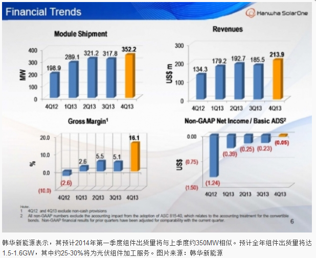 韩华新能源表示,其预计2014年第一季度组件出货量将与上季度约350MW相似。预计全年组件出货量将达1.5-1.6GW,其中约25-30%为光伏组件加工服务。根据该公司,毛利率目标为15-20%。
