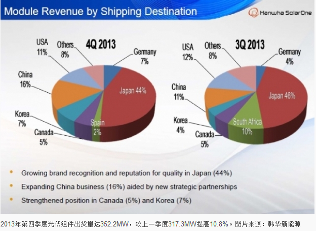 2013年第四季度光伏组件出货量达352.2MW,较上一季度317.3MW提高10.8%。