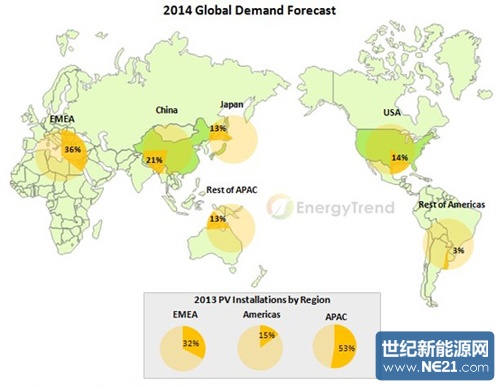 回顾2013年,太阳能供应链厂商从不断亏损的低谷中逐渐走出阴霾。根据TrendForce绿能事业处EnergyTrend调查显示,2013年全球太阳能市场需求逐季叠高,并网量落在31.5GW,实际需求量受到日本与中国大陆市场预先拉货安装的力道优于预期带动,较年初所预测的33GW提高到35.8GW,其中亚洲需求量最大占比达53%,其次为欧(含中东与非洲)的32%、美洲占15%。