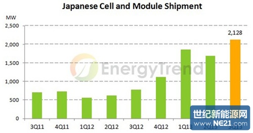 另外,目前通过设备认定的容量虽高,但预期日本政府会在接下来3年内平均消化完毕,且又有消费税提高及发电收购价格调降等因素干扰,本年度安装量比起去年将稍有衰退。但日本投资报酬率仍优于世界各地,且预计今年安装量占全球比例将高达13%,依旧为太阳能制造商的兵家必争之地。根据JPEA资料显示,受惠于日本内需市场,日本本土厂商电池片及模组2013年7~9月出货量达2.1GW(图2),创历史新高,年成长率高达173%。夏普(Sharp)、Panasonic、京瓷(Kyocera)等大厂,在最新公布的财报中,太阳能部分都有亮眼的表现。
