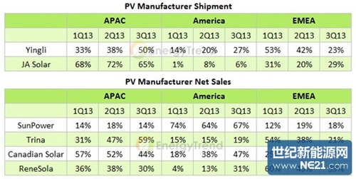 受到中欧贸易纷争以及上述亚洲市场崛起的影响,中国大陆太阳能厂商策略布局在2013有很大的转变。EnergyTrend针对2013年各太阳能厂出货及营收调查(图3)显示,中国大陆大厂明显降低欧洲出货占比,将重心转向中国大陆内需市场以及日本等其他亚洲市场。从2013模组出货量最大的两家厂商英利及天合光能来看,英利在2013年第一季对欧洲出货占总出货量的一半以上,至第三季时对欧洲出货量只占23%。天合光能2013年第一季的欧洲营收占总营收的54%,第三季则降至21%。
