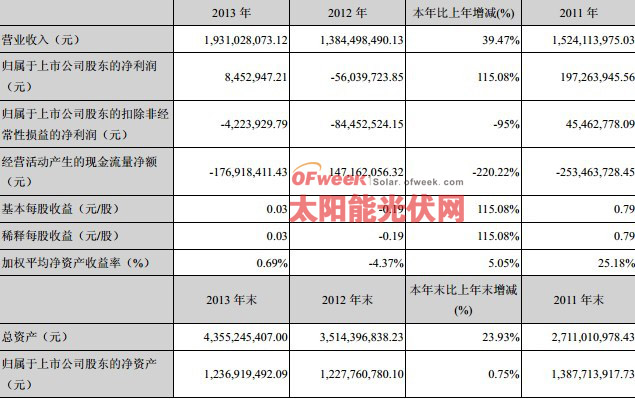 报告显示,2013年度爱康科技营业收入为193,102.81万元,同比上涨39.47%。净利润845.3万元,同比上涨115.08%。基本每股收益0.03元,同比增长115.08%。