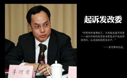 李河君在金沙江上庞大的水电计划没有一帆风顺。“所有的部委都批了,只剩发改委不同意——他们不相信民营企业有能力干成这样的项目,认为该给国有企业干。”李河君回忆说。发改委的怀疑并非没有根据,要知道,此前总装机容量为271万千瓦的葛洲坝水电站建设时几乎是倾全国财力,动用5.5万人的军队,历时16年才建成,更何况民企要建水电站。然而李河君并不接受这样的结果,他依靠与云南省政府签订的合同,把发改委告上了法庭。