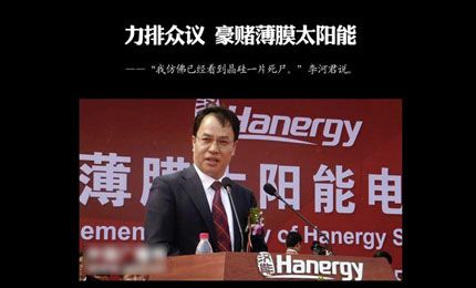 2012年下半年开始,全球光伏市场遭遇寒冬,昔日的光伏明星企业赛维、尚德相继倒下,而李河君仍然继续他的薄膜太阳能豪赌。2012年底,李河君高调宣布,汉能的光伏组件产能已达3GW,超越美国第一太阳能公司(FirstSolar),成为全球最大的薄膜太阳能企业以及太阳能发电系统集成商。