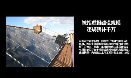 去年6月21日,国家审计署发布的一则名为“5044个能源节约利用、可再生能源和资源综合利用项目审计结果”的公告,指出广东汉能光伏10兆瓦光伏发电项目单位存在多报建设规模和装机容量的现象,违规获得中央财政金太阳示范工程补助资金2637.25万。对此汉能集团解释称,因受安装条件限制,10兆瓦的计划实际完成了5.18MW,并已并网发电,其余的4.82MW容量建设地址变更,而汉能也于2012年12月将补贴资金2637.25万元退还给了河源市财政局。