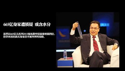 去年10月,2013年福布斯中国富豪榜发布,李河君以665亿元资产位列第四位,仅次于王健林、宗庆后和李彦宏,超过了第五位的马化腾。一时间,李河君这个名字为更多人知晓。