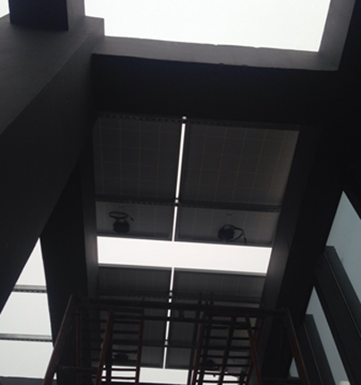 该发电项目位于20层高的办公写字楼。楼顶总面积为(41m*71.4m)为2927.4m2,系统总装机容量为50千瓦,由佛山徳九新能源光电有限公司投资50万元建造。系统使用了220块230W多晶硅光伏组件,通过并网逆变器将光伏组件产生的直流电逆变成交流电,逆变器交流电输出端接入配电箱,同时接入380伏交流大电网中,从而形成以自发自用为主,多余电量上网的运行模式。