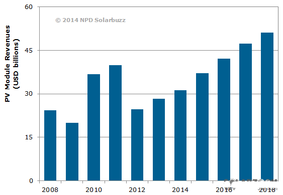 根据NPDSolarbuzz最新出版的Marketbuzz报告显示,太阳能光伏产业预计将在未来五年快速发展,2018年全球太阳能年度装机可能高达100GW。这种终端市场的增长将提高光伏组件销售收入,2018年预计将达500亿美元。