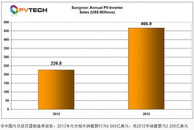 该中国光伏逆变器制造商报告,2013年光伏相关销售额约为4.669亿美元,而2012年销售额为2.268亿美元。