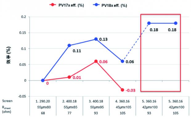 眼下细栅技术在电池企业之中得到试验与推广,但其中存在的技术难度也变得越来越高,比如减少丝网印刷栅线宽度尽管有助于减少遮蔽带来的损失,但却会导致栅线线阻更高,这是留给设备制造商以及浆料供应商的一个共同课题。为减小由于正面栅线条数增加引起的正面电极的遮蔽效应,需要采用阻挡板、银浆微加热等技术解决了细栅线印刷问题,减小正面遮光面积。 还有二次印刷技术,在电池片上需要刷两次导电银浆,要求对准精确,这些都需要丝网印刷、烧结炉等设备与浆料更好的兼容配合。