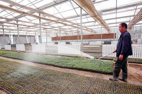 阿图什市设施农业产业科技示范园技术人员正在为培育的蔬菜幼苗浇水