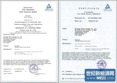 德国莱茵TÜV认证,针对产品安全,可用性,环境适用性等多方面进行评鉴考核,为产品提供安全和品质认证。认证审验过程严格全面,是全球范围内认可的产品高品质、安全可靠性能的权威证明。据悉,此次取得认证的兆瓦级集装箱式解决方案SG1000TS,是阳光电源在2013年下半年推向市场的一款解决方案。该方案采用十英尺标准集装箱外形,设备占地仅7平米,叉车即可转运安装,方便灵活;四面开门的设计,使内部设备安装维护更加便利;同时配备进出风口专利结构设计和高效组合散热专利设计,有效防尘,高效散热。该方案成功通过第三方高低温、湿热交变,防水防尘等严酷的环境试验,并在德国莱茵TÜV认证检测中,顺利通过全部的认证检测项目。