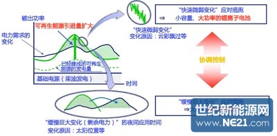 光伏和风力发电输出功率的变化分为云彩飘等日照量变化、风速变化带来的“快速微弱变化”(短周期变化),以及太阳位置变化等带来的“缓慢巨大变化”(长周期变化,剩余电力)。离岛一般是利用柴油发电机来调节输出功率的变化,但随着可再生能源引进量的大幅增加,调节能力将出现缺口,要想进一步扩大引进,就必须活用蓄电池调节输出功率的变化。