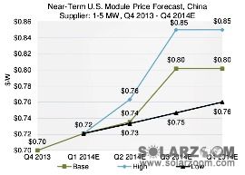 “目前,中国公司2014下半年交付的组件报价每瓦很可能将超出80美分,高于2013年底的每瓦70美分。”