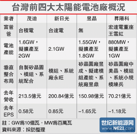 新日光合并旺能之后,现阶段电池产能为全台之冠,也积极扩充模块产能;在系统方面,则由旗下永旺能源陆续在美国、日本等地开发案源。昱晶是台湾前三大电池厂,在矽晶圆方面有昱成支持,同时规划自建模块产能,系统端由昱鼎负责。昱晶总经理潘文辉先前表示,只要能互补并扩大规模,对于昱成并购,态度开放。