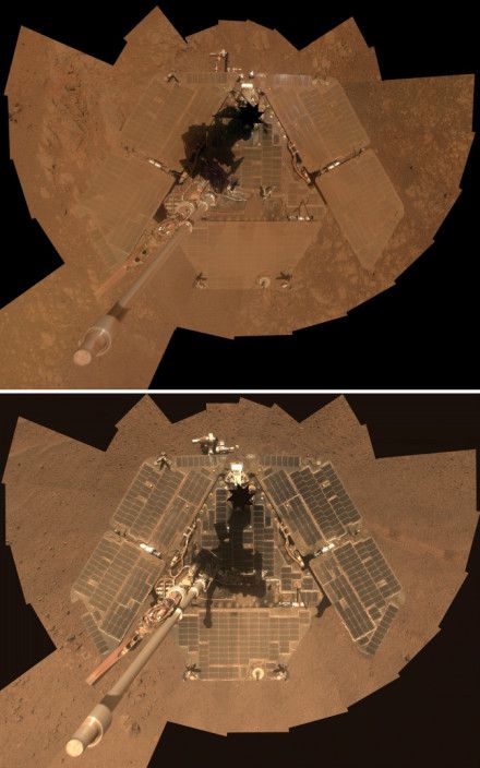 索比光伏网讯:“机遇号”火星车的自拍图,第一张拍摄于2014年1月,第二张拍摄于2014年3月底,通过对比可见,“机遇号”火星车太阳能电池阵列的尘土已经被吹散了,又可以工作啦。