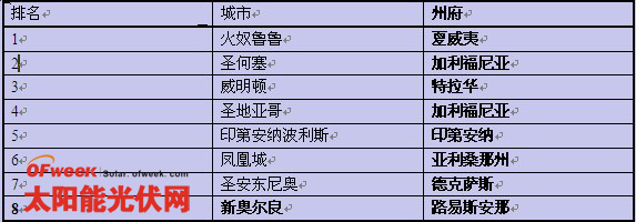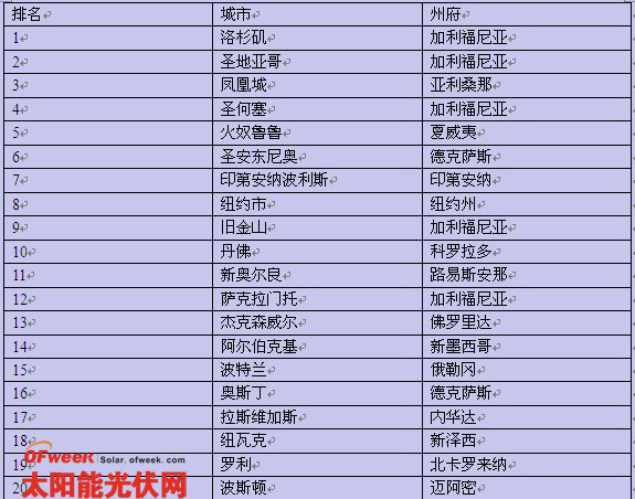 这份报告中还提到一些美国太阳能发电的一些数据。比如说,全美太阳能发电应用城市20强,收集了六年来美国主要太阳能发电应用城市的装机数据。其中,安装量最高的5个城市(三个在加利福尼亚,以及火奴鲁鲁和凤凰城)的安装量数据最令人吃惊,这些安装量最高的城市如印第安纳波利斯、纽瓦克的数据代表了美国当前太阳能发展的普遍现状。