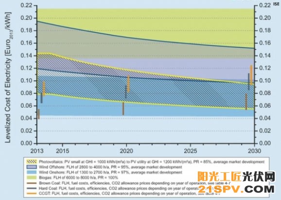 根据弗劳恩霍夫太阳能系统研究所(Fraunhofer ISE)进行的一项新研究,预计2030年德国太阳能光伏和向岸风能的平准化发电成本(LCOE)将下滑至低于的化石燃料的成本。