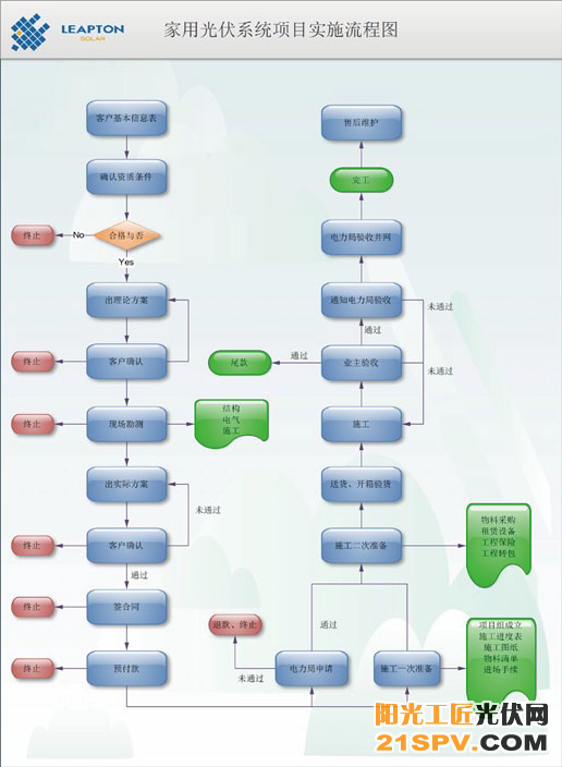 经过多个分布式光伏发电项目的施工,我公司总结家用、小型工商用(小于100KW)分布式光伏发电项目具体实施流程如下。