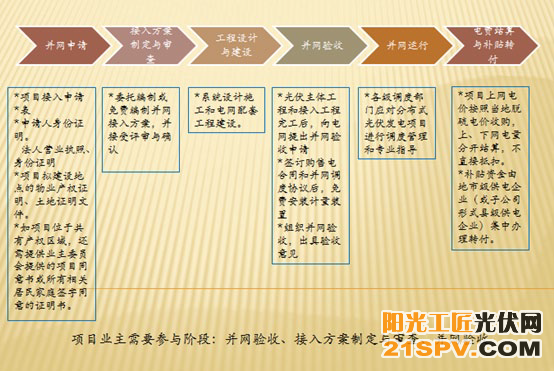 完成项目建设工作后,业主填写《分布式光伏发电项目并网验收和调试申请表》,电网受理后将上门为业主进行验收、更换电表、与业主签订购电协议。