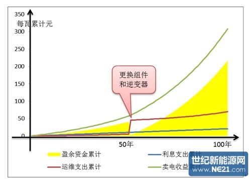 现在我们再通过模型鉴定百年电站的发电成本。和25年电站不同,百年电站并不需要预留现金作债券的赎回,因为50年或100年后的1元,可能比不上今天的1分。因此,将电站的剩余资源(例如玻璃、电缆中的铜等)出售已可获得赎回资金。但百年电站则要考虑期间组件和逆变器的更换。假如技术的进步令逆变器及组件的未来更换价格在今天的折现值(Net Present Value)只有今天价格的50%,寿命50年,我们可以获得下列的图表。