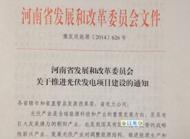 索比光伏网讯:2014年4月21日,河南省发改委向各个省辖市和省直管市发改委、省电力公司下发《关于推进光伏发电项目建设的通知》,以推动2014年光伏项目的备案和良性发展。按照文件要求,各地市需要在今年5月底前将项目实施方案上报省发改委,省发改委将按照项目投产先后顺序纳入国家光伏发电补贴资金支持范围。河南省发改委在做好已有配额项目外将向国家能源局争取更多的补贴指标。