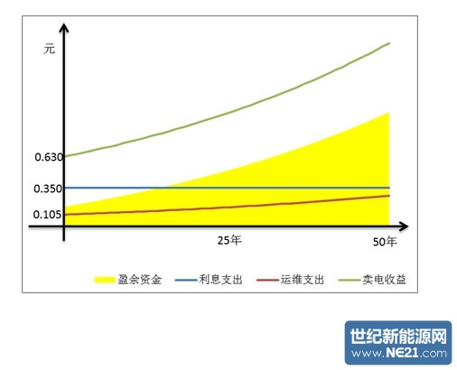要找出光伏发电生存的道路,必须由光伏发电独有的特点出发。和火电及水电发电设备比较,光伏发电设备是静态设备,维护和运作成本低,大型光伏电站的每年维护及运作成本大约是投资额的1.5%。太阳的辐射量稳定,因此,光伏系统的发电量是长久可预测的,只要上网有保证,现金流也是长久可预测的,不像火电受原料价格和机组维修等因素影响。光伏组件的寿命长,25年只衰减20%,并且仍可发电,需要更换的只是逆变器的零件,在支架方面,使用混凝土作支架,使用寿命可达50年甚至100年。而当前商业化的保险工具,已可为电站的发电量提供15年的保证。掌握了这些特点,我们便可以把电站的使用寿命设计为50年甚至100年。每25年更换一次组件及损耗件。这样的电站的二次投资会低许多。这还未算未来25年的技术进步所带来的成本下降。而上网电价基本上是和通胀挂钩的。世界平均电价每年上升约3%。有了这些数据,我们便可以进行财务模型的设计。假如每瓦的年发电量为1.5千瓦时,第一年的每度上网电价为0.42元,固定利率不还本是5%(永久债利率),每瓦投资7元,我们得出下列的曲线。