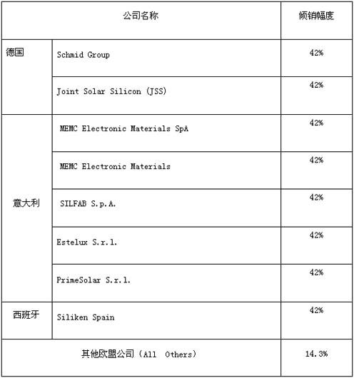 根据《反倾销条例》的有关规定,调查机关向国务院关税税则委员会提出对原产于欧盟的进口太阳能级多晶硅征收反倾销税的建议。国务院关税税则委员会根据调查机关的建议作出决定,自2014年5月1日起,对原产于欧盟的进口太阳能级多晶硅征收反倾销税。对各公司征收的反倾销税税率如下: