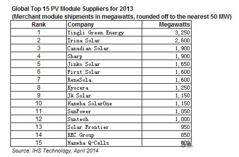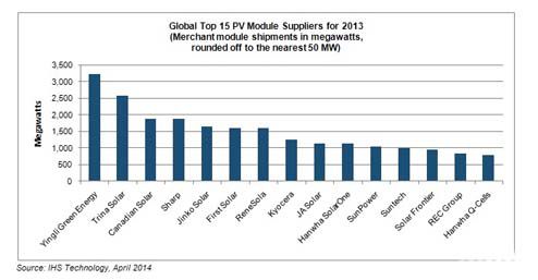 索比光伏网讯:据研究机构IHS《2014年第一季度光伏一体化市场跟踪》(Q1PVIntegratedMarketTracker)显示,2013年,全球领先太阳能组件供应商主导地位巩固,中国企业更是风光耀眼,领先群雄。