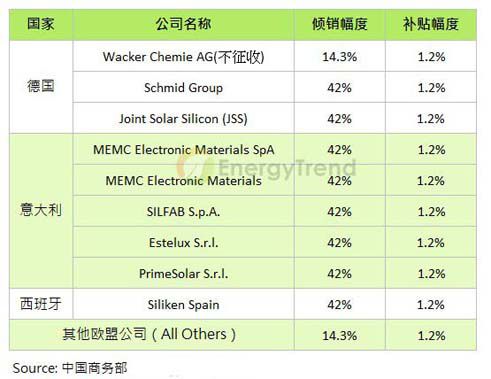 索比光伏网讯: 在欧盟决定对中国太阳能组件玻璃课征双反税率后,中国政府立刻展开报复行动。中国商务部于4月30日宣布对欧盟输入之太阳能级多晶硅课征反倾销与反补贴税率,其中反补贴税率均为1.2%,而反倾销税率则分为二级,分别为14.3%与42%。