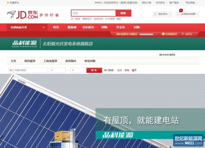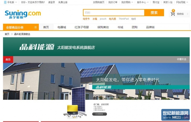 世纪新能源网报道:继晶科能源入住天猫商城后。今5月8日,晶科能源宣布该公司已经成功入住京东商城与苏宁易购。京东旗舰店:http://jinkosolar.jd.com/;苏宁旗舰店:http://shop70074126.suning.com/ 。记者发现,晶科在苏宁易购的产品已经上架,在京东的产品还未正式上架。晶科宣称让光伏发电进寻常百姓家,晶科带您进入零电费时代!