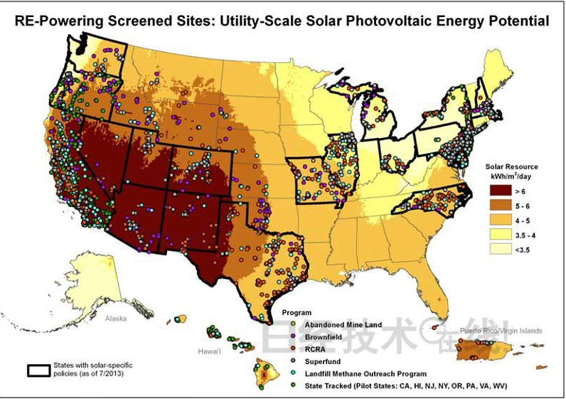EPA于2013年11月出台的报告显示,迄今为止,在筛选出的场地,一共启动了85个可再生能源项目。总量高达507MW。其中,光伏发电系统占到151MW。EPA调查的污染场地多达6.6万处以上,总规模达到3500万英亩。其中,能够建设光伏发电系统的潜在发电量预计超过5.5GW。