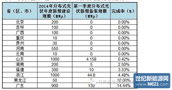 表1 2014年第一季度十三省(区、市)分布式光伏发电建设完成情况