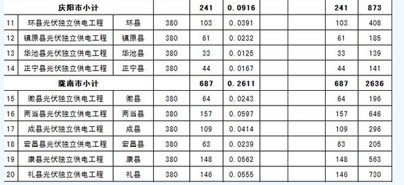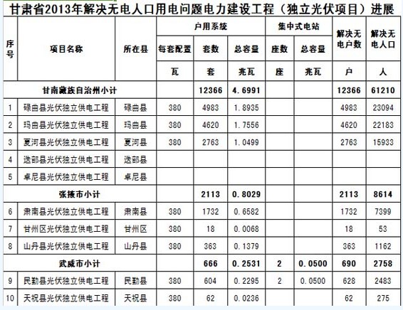 按照国家能源局《全面解决无电人口用电问题三年行动计划(2013-2015年)》和甘肃省委省政府“1236”扶贫攻坚行动安排部署,国家投资支持通过太阳能发电装置供电(光伏发电)和大电网延伸解决甘肃省2.4万户、11.6人无电人口的用电问题,计划在2014年底完成项目建设任务。