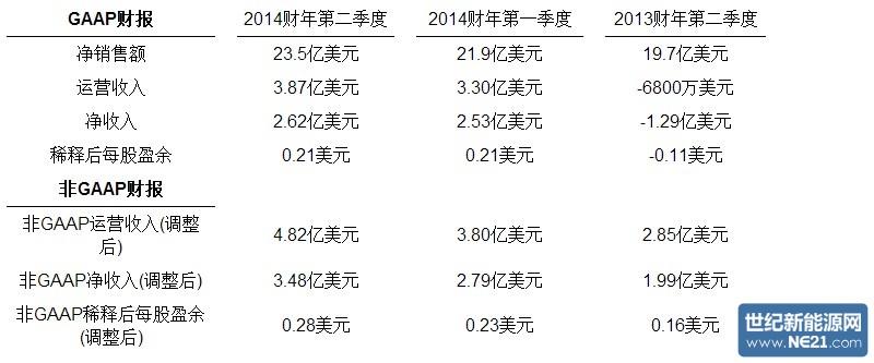 2014财年第二季度,应用材料公司的订单总额为26.3亿美元,较上一季度增加15%,主要受到平板显示和半导体产品事业部的强劲增长所带动。净销售额为23.5亿美元,较上一季度提高7%,主要得益于半导体产品事业部的增长。本季度,调整后的非GAAP毛利率环比提高170个基点至44.2%;非GAAP运营收入环比增长27%至4.82亿美元,占净销售额的20.5 %;调整后的非GAAP净收入环比增长25%至3.48亿美元(稀释后每股盈余0.28美元)。本季度GAAP毛利率为42.5%,运营收入为3.87亿美元,占净销售额的16.4%,净收入为2.62亿美元(稀释后每股盈余0.21美元)。