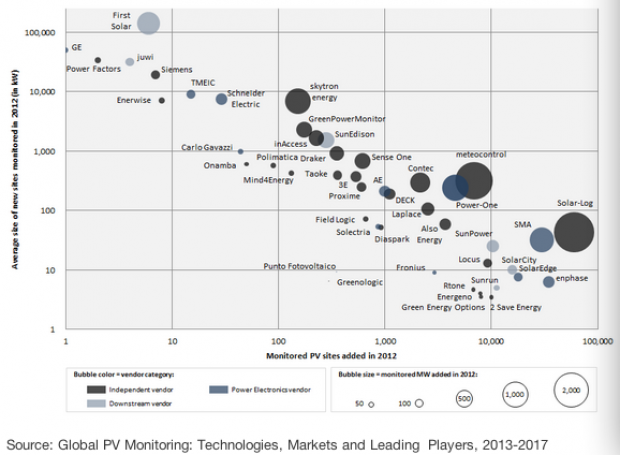 索比光伏网讯:根据GTMResearch和SoliChamba咨询公司合作的最新季即将公布的报告显示,2013年全球光伏监测市场排名产生了微妙变化,第三方监控企业出现在明显的位置,并有越来越占据主导地位的趋势,如solarlog、meteocontrol、TAOKE等。