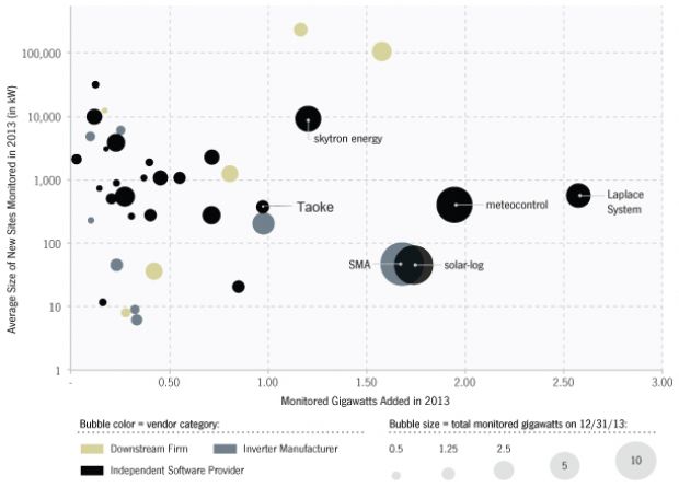 随着全球光伏市场的发展,大量的新的光伏电站装机出现在新兴市场,同时也带动了当地市场监测公司的发展,我们逐渐看到一些新的第三方监控平台出现在排名里。得益于中国光伏市场的大力开拓,在最新2013年全球光伏监测报告预览中,我们看到中国TAOKE上升迅速。